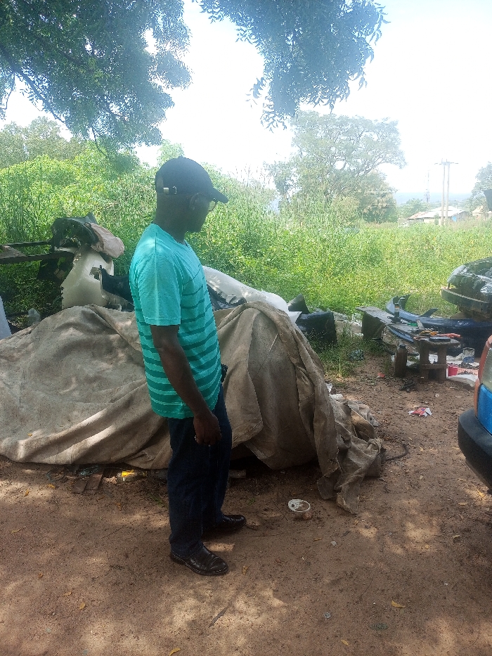 An adult male is observed standing outdoors in Adankolo, Nigeria, within what appears to be an informal workshop or junkyard area