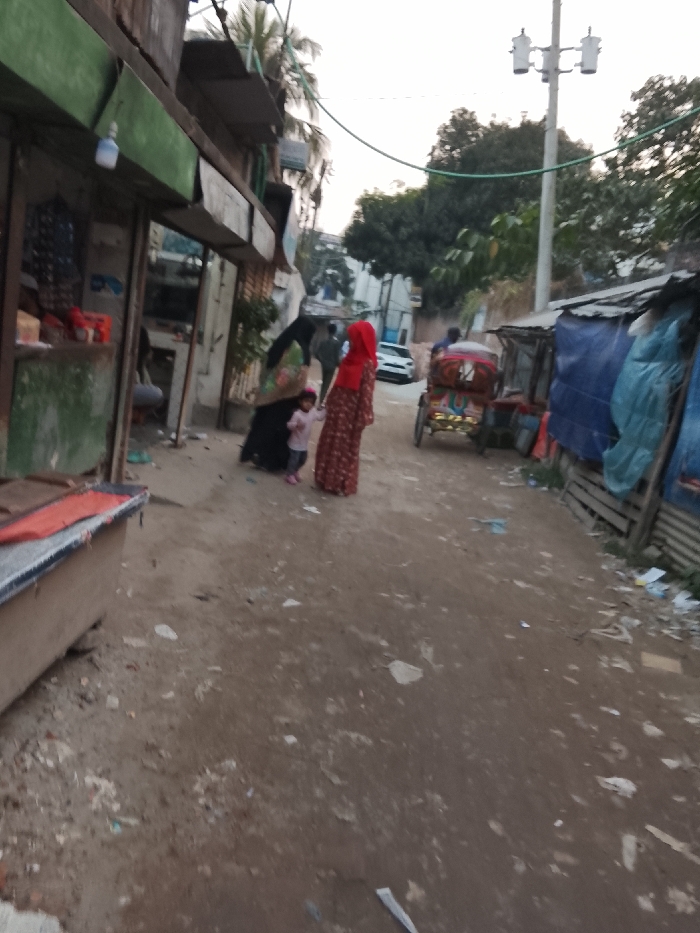 The image depicts a narrow, unpaved street or alleyway in Tarabo, Bangladesh. The ground consists of compacted dirt and mud, strewn with various debris including plastic and paper. On the left side of the scene, a row of simple, multi-story buildings stands. The structures feature green-painted wooden fascias or awnings. Items, possibly merchandise, are visible inside or displayed near these buildings, one of which appears to be a commercial stall with a low counter in the foreground. To the right, several rudimentary structures are present, constructed from wood planks, corrugated metal sheets, and blue tarpaulins, suggesting temporary shelters or informal market stalls. Accumulations of refuse are visible on the ground adjacent to these structures. In the mid-ground, three individuals are grouped. One adult female wears a dark hijab and possibly a patterned garment, facing right. Another adult female wears a red hijab and a reddish-brown patterned dress, facing towards the first female. A small child, wearing a light top and pink shoes, holds the hand of the female in the red hijab and faces the female in the dark hijab. Further down the alley, a decorated bicycle rickshaw with a red top is visible, positioned slightly right of center. An individual appears to be seated on the rickshaw. In the distant background, a white sedan is partially visible on what appears to be a paved road. A tall utility pole with a transformer is also present. Overhead, power lines run across the frame. Scattered trees and foliage are visible in the background against an overcast or twilight sky.
