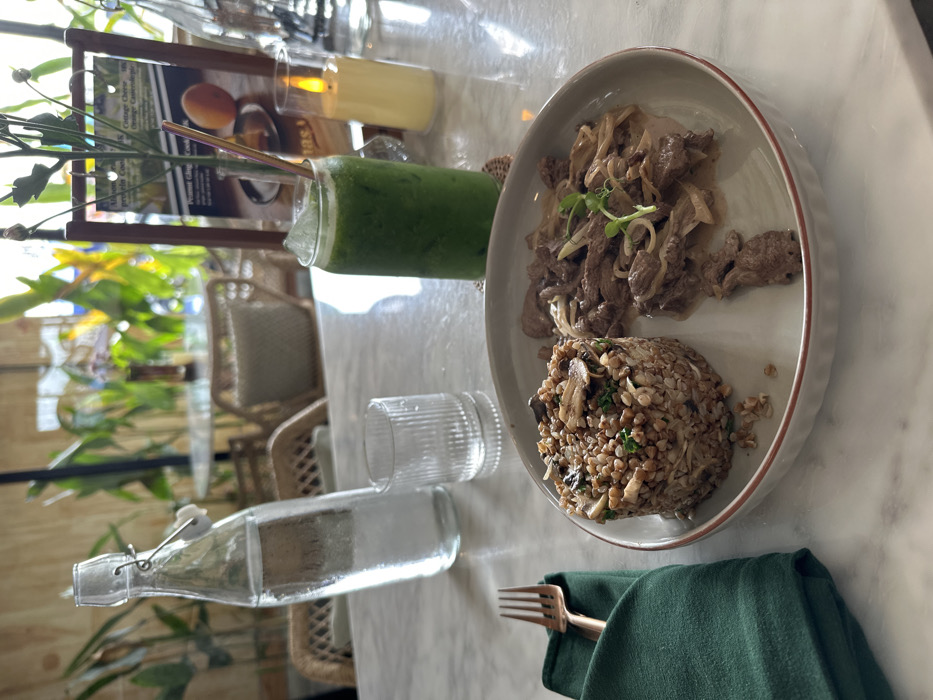 A meal of buckwheat and mushrooms sits alongside strips of meat with pale onions on a white plate with a red rim. A green smoothie with a straw, a bottle of water, and a glass are on the table. A green napkin with a fork rests near the plate. A menu board and yellow beverage are in the background. The dining area is brightly lit and features woven chairs.