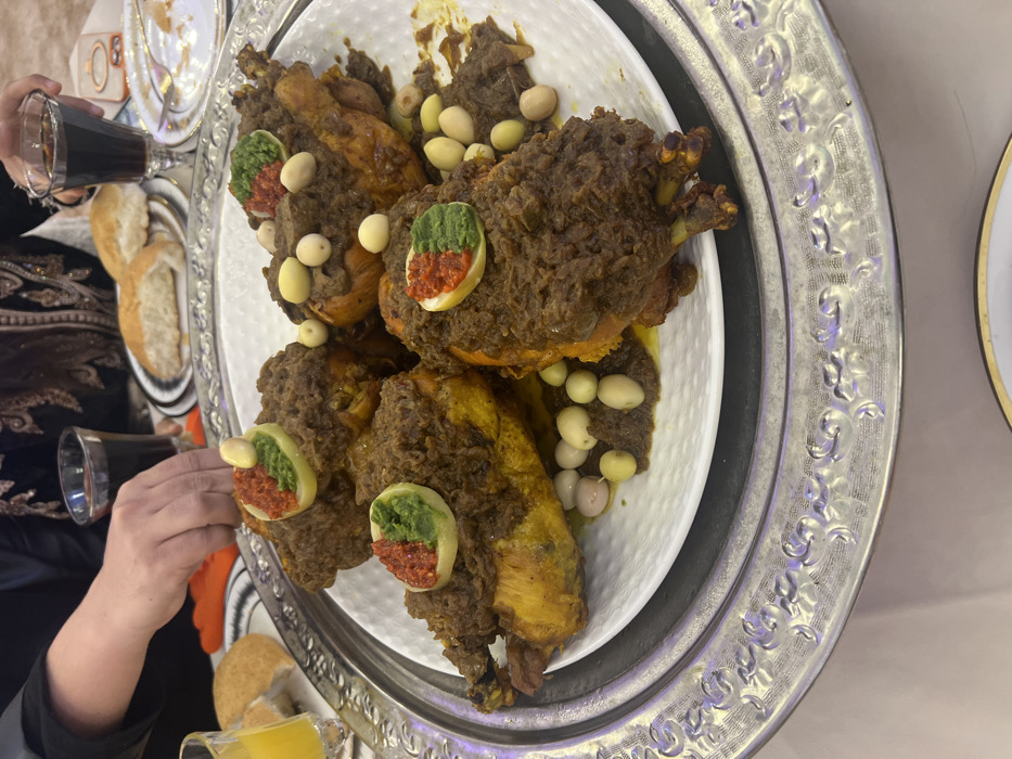 Four pieces of chicken are arranged on a white plate. A brown sauce and blanched almonds cover the chicken. Each piece is garnished with a slice topped with green and red. The white plate sits atop a larger, decorative silver platter. Bread rolls and a glass of dark liquid are visible. Part of another plate is visible in the background. Two hands holding a drink are visible on the left.