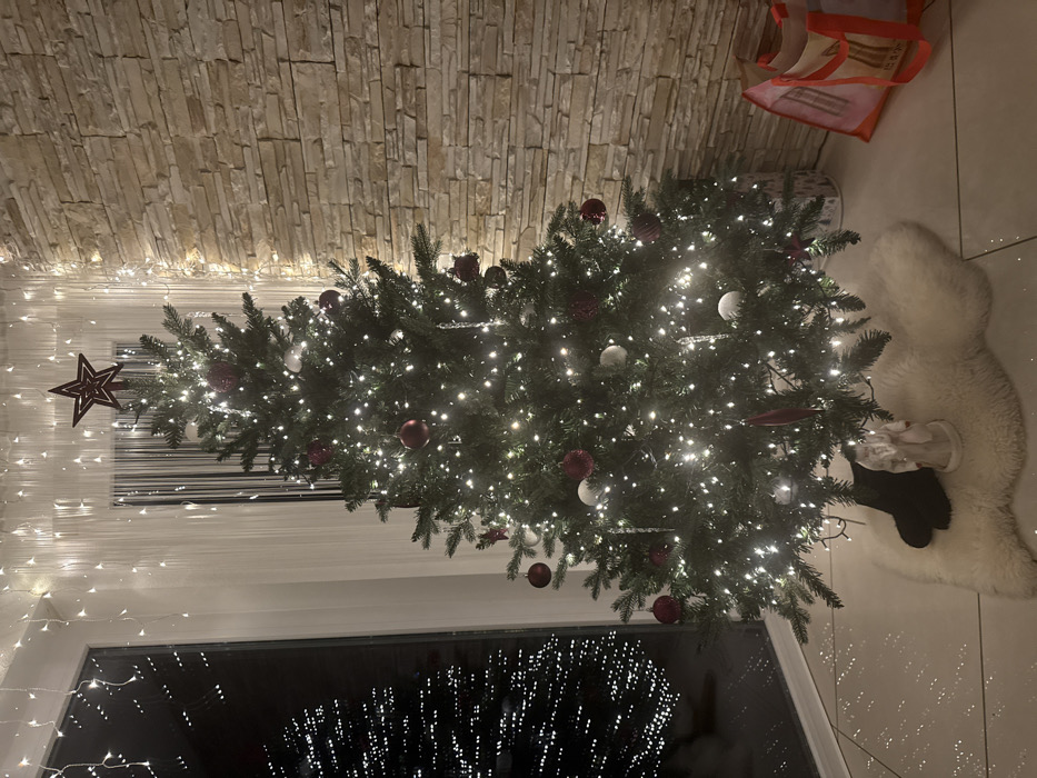 A Christmas tree adorned with white and red ornaments, along with strands of white lights, stands indoors. A star tops the tree. A furry rug is at its base, with a white figure placed on it. The scene is reflected in a window below. A textured stone wall forms the backdrop, with more white string lights near the top of the window frame. A red and white bag is situated in the upper right corner.