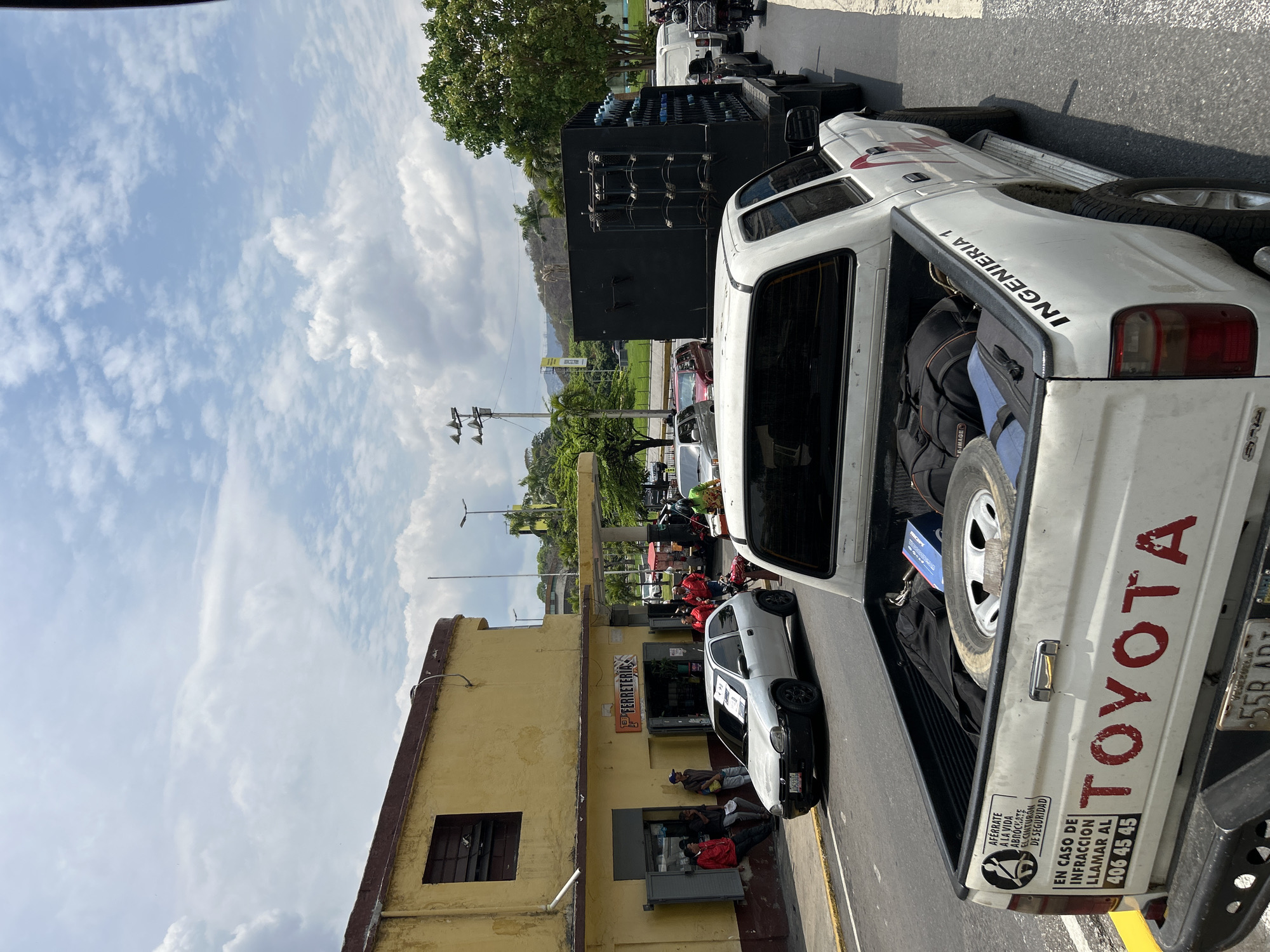 The image captures a street scene in Caracas, Venezuela. In the foreground, a white Toyota pickup truck is parked on the side of the road, its bed filled with luggage and a spare tire. The word "TOYOTA" is prominently displayed in red on the tailgate, along with a sticker containing safety instructions and a phone number. To the left of the truck, a yellow building is visible, with a sign that reads "FERRETERIA" (hardware store). Several people are sitting or lying on the ground near the building. Further down the street, there is a line of vehicles, including a small white car and a black truck with what appears to be a large sound system. The sky is partly cloudy.