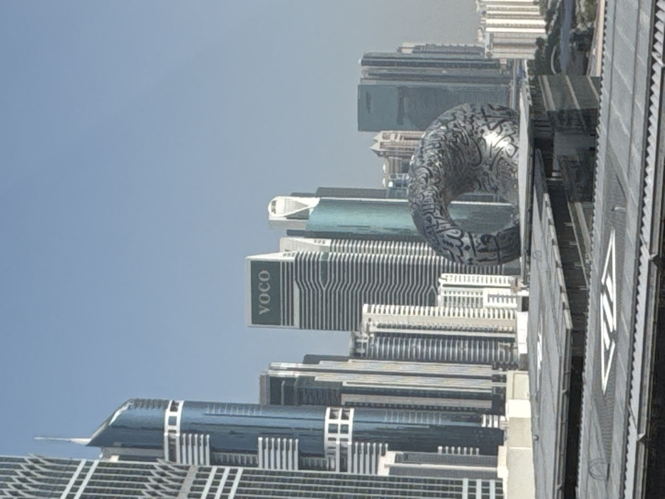 The cityscape shows modern architecture against a clear sky. A distinctive donut-shaped building adorned with Arabic calligraphy stands prominently. Skyscrapers, including one displaying "VOCO" vertically, dominate the view. Linear patterns of buildings and structures are visible in the foreground, extending toward the right edge of the frame. A muted palette emphasizes the architectural details.