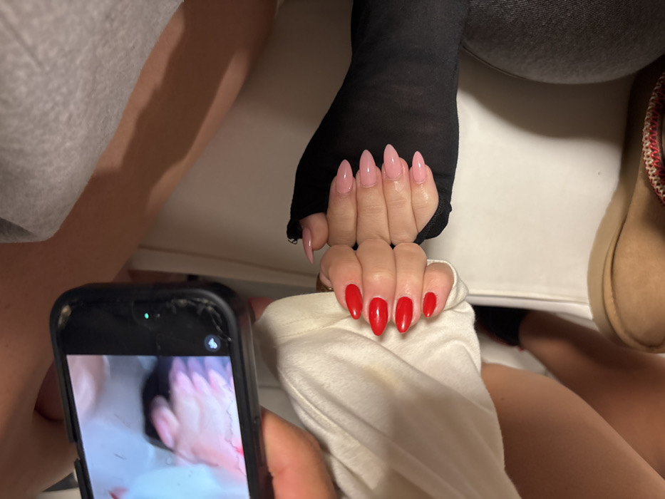 The image depicts an indoor scene in Tel Aviv, Israel, centered on two hands with manicured nails being photographed. The hand on the left features light pink, almond-shaped artificial nails and is partially obscured by a black long-sleeved garment with a thumbhole. The hand on the right displays vibrant red, almond-shaped artificial nails and is partially covered by a light-colored long-sleeved garment exhibiting a visible yellowish stain. These two hands are positioned closely together, serving as the primary subject. In the lower right quadrant, a dark-colored smartphone, held by a third individual, is actively capturing the scene; its screen displays a partial view of the pink nails, and the phone's screen protector shows multiple cracks. A faint green light is visible on the phone's bezel. The surrounding environment includes blurred sections of clothing in grey and tan hues, and indistinct light-colored surfaces, suggesting a casual, seated arrangement.