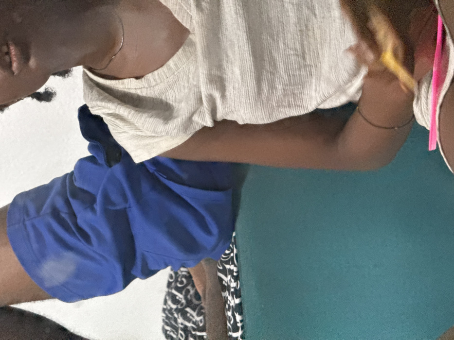 - "A person is seen from the chest down, wearing a cream-colored t-shirt, blue shorts, and a pink and white bathing suit" by FM-Vky7v2, licensed under CC BY 4.0