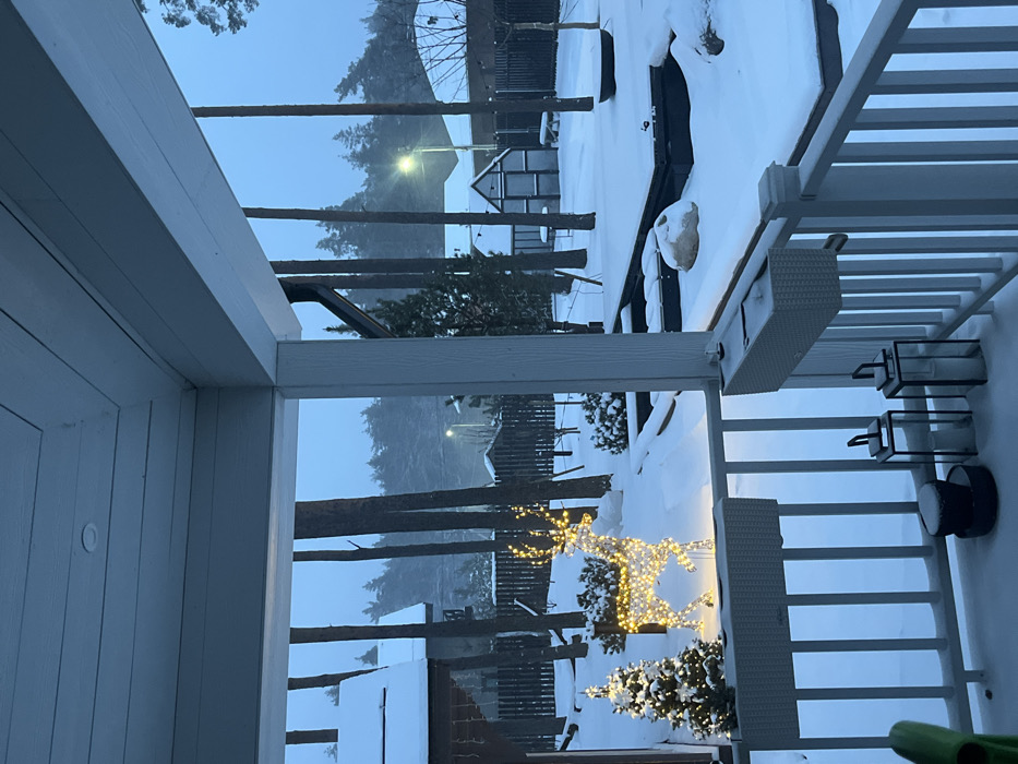A snowy scene is viewed from under a white porch. Tall trees are visible beyond a decorative light-up reindeer and a small Christmas tree. Snow covers the ground and building roofs. A black fence is seen in the background. Outdoor furniture like a lantern and planters are coated with snow on the porch. The photo seems to have been taken during dusk or in low lighting conditions.