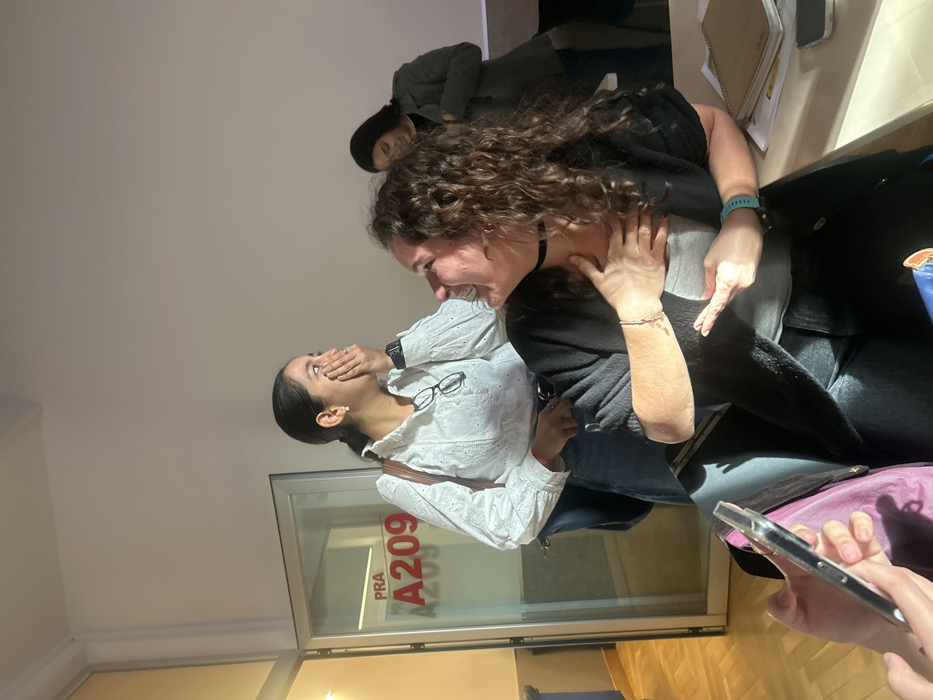 Two women are indoors, seemingly startled. One, in a white blouse, has her hand over her mouth with wide eyes. The other, with curly hair and a black choker, is looking at the first woman, with her hand raised to her neck. Another person sits behind them. Someone is holding a phone up near the bottom of the image. A door with "PRA A209" visible on it is nearby.