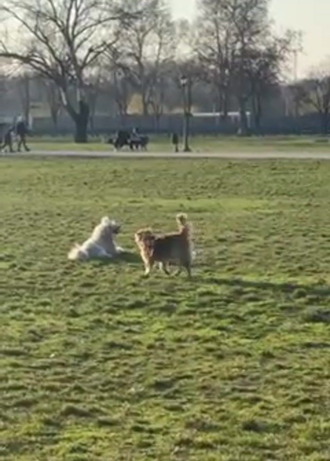 two dogs in a park. One is a golden retriever, and the other is a white fluffy dog. The golden retriever is standing up and looking towards the white dog, which is lying down. In the background, there are people walking and sitting on benches. There are also trees and a car visible in the distance. The ground is covered in green grass.
