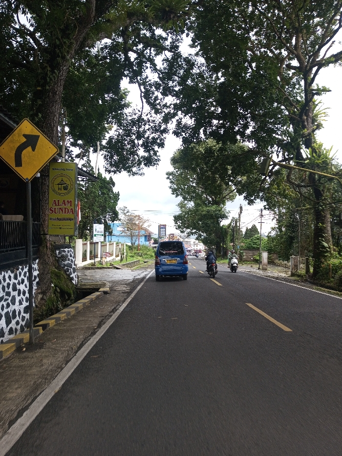 This image depicts a two-lane asphalt road in YonPhoogla, Bhutan, under an overcast sky. Large green trees line both sides of the road, their canopies forming an arch overhead. On the left side of the road, a yellow diamond-shaped road sign with a black curved arrow pointing right is mounted on a pole. Below it, a rectangular yellow sign displays "WARUNG NASI ALAM SUNDA" with text in an Indonesian-like script and a stylized bowl icon. Adjacent to these signs is a building with a black and white checkered lower facade. A concrete sidewalk with yellow curb markings and a drainage channel is visible next to the building. Three vehicles are traveling on the road, moving away from the viewer. The lead vehicle is a blue van or minivan, positioned centrally in the lane. Behind it, a person operates a dark-colored motorcycle. Further back and to the right, another person operates a light-colored scooter. The road surface features a solid yellow line near the left edge and a broken yellow line further right, indicating directional traffic. Two individuals are discernible operating the motorcycles. Utility poles and additional distant buildings are visible in the background.