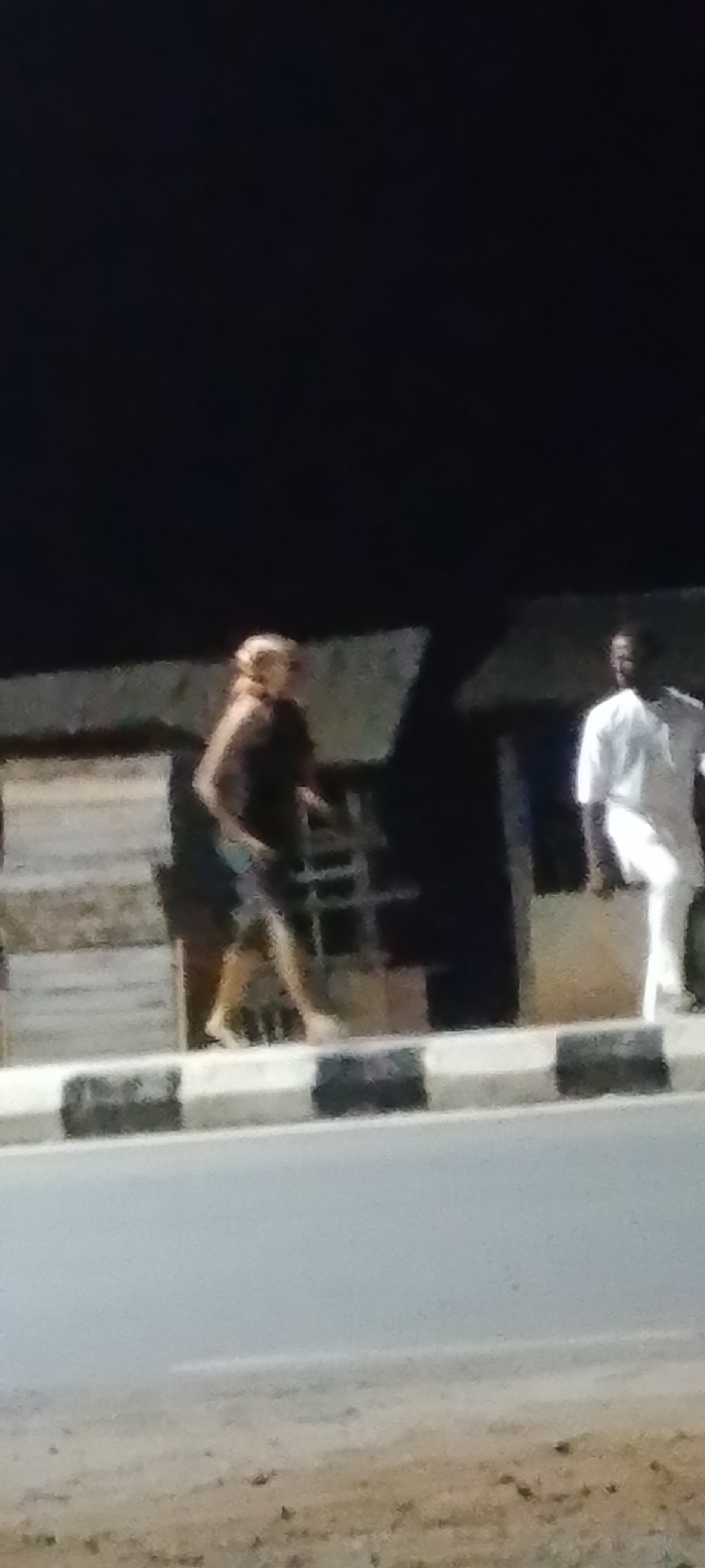 The image captures a dimly lit nighttime scene in Zango-ndaji, Nigeria, along a roadside. In the left midground, a light-skinned individual with light-colored hair, wearing a dark top and shorts, is in motion, walking leftward. This individual appears to be barefoot. To the right, a dark-skinned male, dressed in a light-colored long-sleeved garment and trousers, stands facing partially towards the left, observing. A paved road is visible in the immediate foreground, separated from a dirt ground area by a black and white striped curb. Behind the individuals, multiple blurry structures, consistent with informal market stalls or small shops, line the background. The overall environment suggests limited artificial illumination.