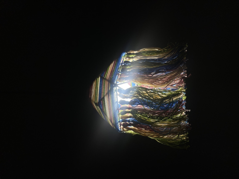 A vibrant lampshade illuminates a dark space. The shade is cylindrical, constructed with vertical stripes of various colors. A thick fringe composed of colorful strands hangs from the base, catching the bright light emanating from within. The light source casts a strong, directional beam, highlighting the intricate details of the fringe and creating a stark contrast against the surrounding darkness.