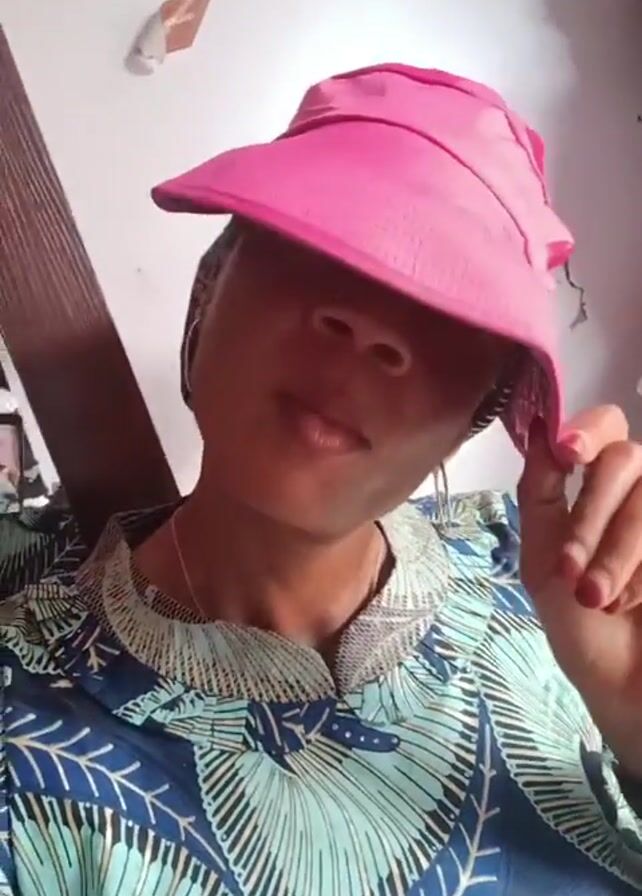 person wearing a pink sun hat and a blue and green patterned shirt. The person raises their finger to their lips in a "shush" gesture. The background is a white wall, and there is a wooden structure behind the person.