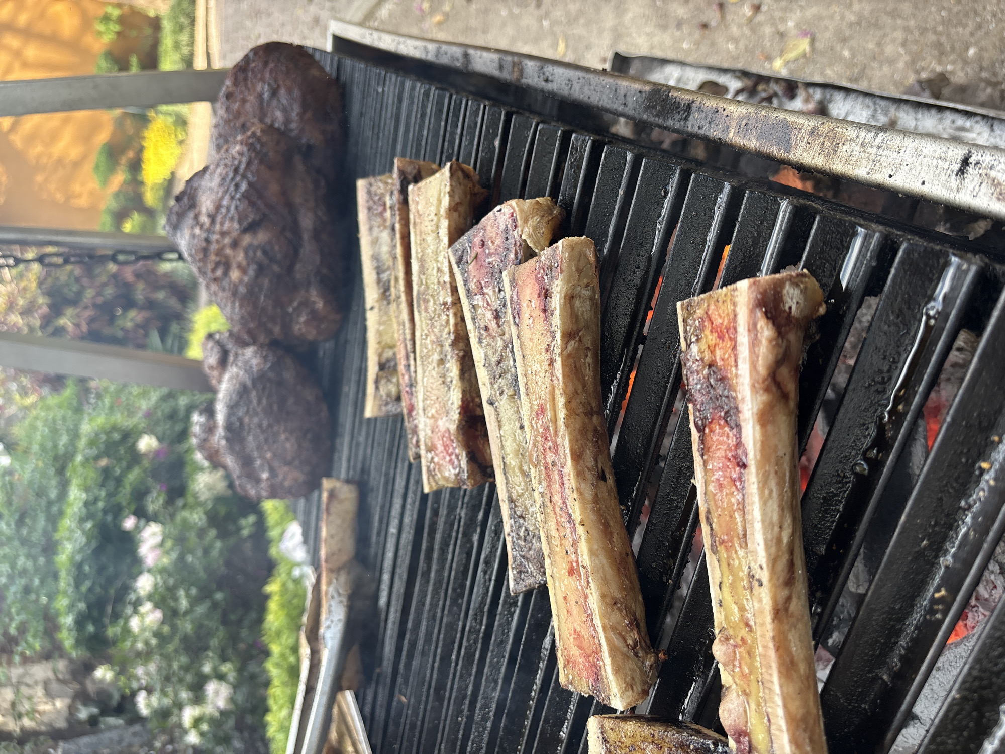 bone marrow and meat grilling on a black metal grill
