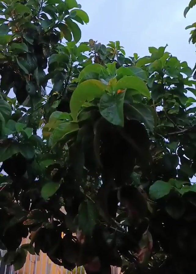 lush green tree with large leaves against a pale, overcast sky. The leaves appear wet, likely from recent rain. A white picket fence is partially visible in the lower left corner, and a white vehicle is situated beneath the tree. The camera angle is looking upwards into the tree. The scene seems to be set in a residential area.