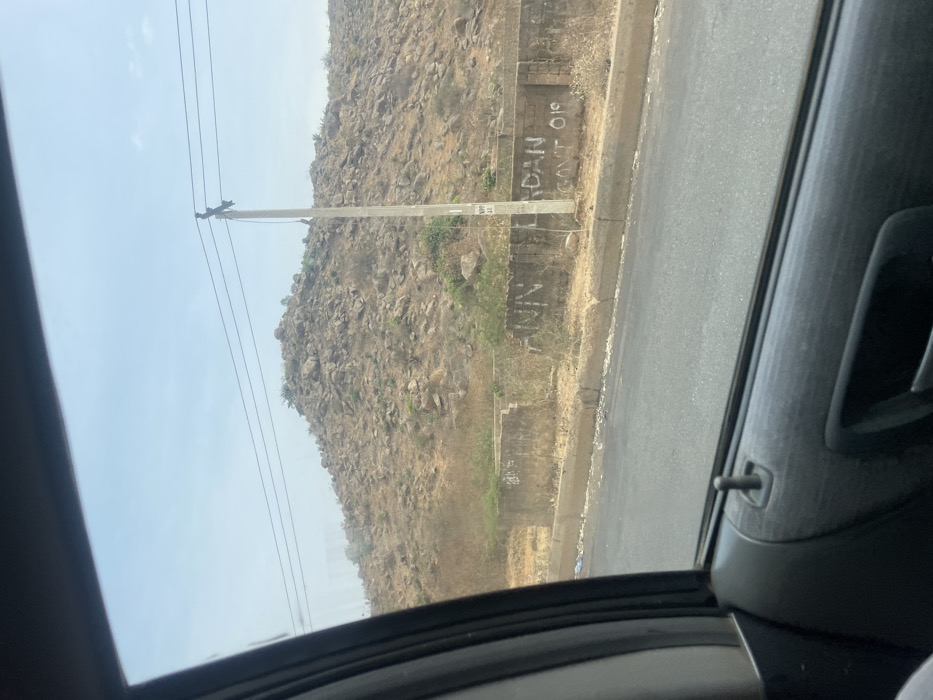The image displays an exterior scene viewed from inside a vehicle, with the dark grey car door trim and window frame visible in the foreground. A black, upward-positioned door lock pin is prominent on the door panel. Outside, a dark asphalt road runs horizontally, bordered by a light grey concrete curb. Immediately beyond the curb is a strip of dry, light brown earth with sparse, green and brown vegetation. A low, rough-textured concrete wall parallels the road, featuring white graffiti that reads "ANN" on the left and "LADAN GOVT 019" further right. A tall, light-colored utility pole stands upright behind the wall, supporting multiple overhead power lines; several small, dark objects are visible on these lines and the pole itself. In the background, a large, rocky hill or mountain dominates the landscape, covered densely with various sizes of light brown boulders and scattered dry shrubs. The sky above is clear and light blue. This scene is located in Zawan, Nigeria.