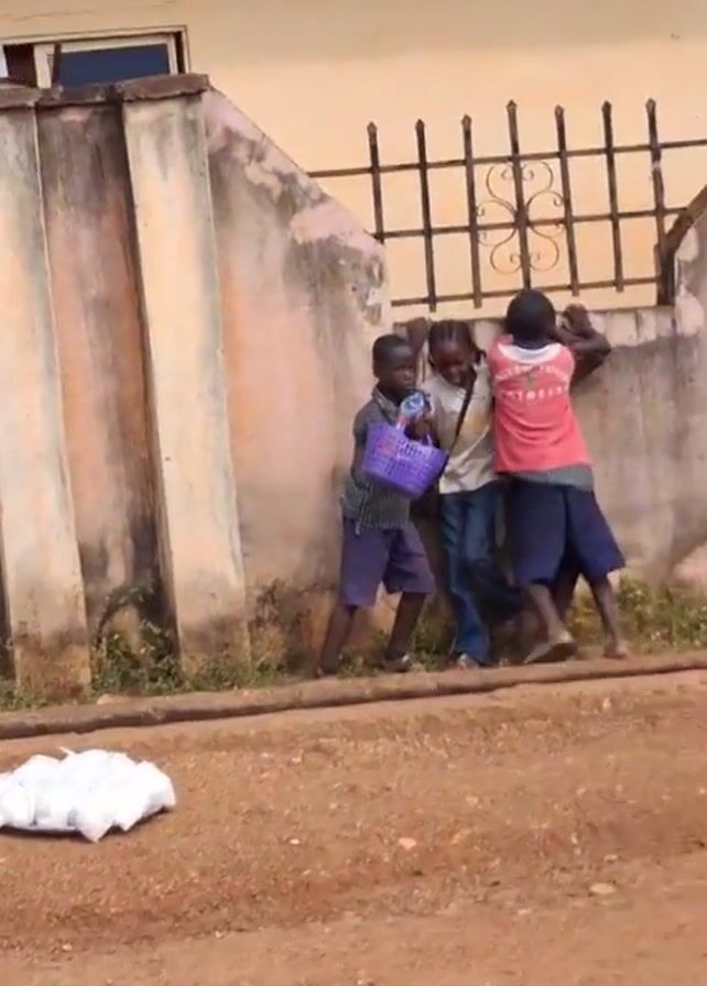 The video depicts a group of children in what appears to be an outdoor setting. Initially, four children are clustered near a wall with a metal gate. One child holds a purple basket. A white bag lies on the ground nearby. Subsequently, the group disperses, and one child sits on the ground near the wall. The environment includes a dirt road and vegetation. A light pole is visible in the distance. The sky appears partly cloudy.