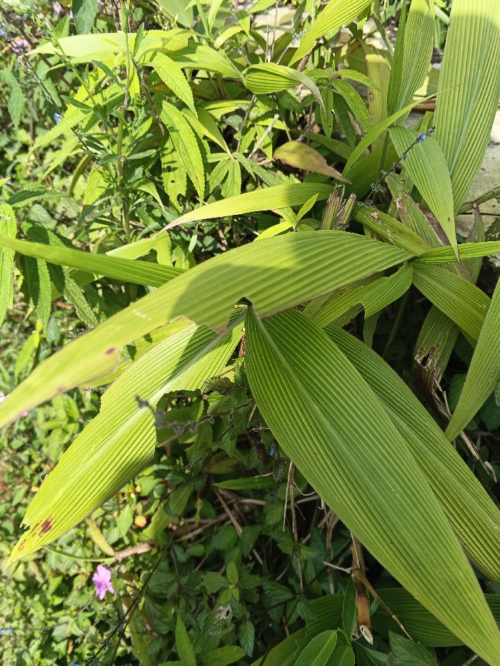The scene depicts a dense patch of sunlit green foliage located in Wenshan City, China. Dominating the foreground and midground are multiple broad, light-green leaves characterized by prominent parallel venation, appearing deeply ribbed. Some of these larger leaves exhibit minor tears or brown discolored areas along their edges and surfaces. Interspersed among and beneath these are smaller, darker green plants with finer leaves, forming a dense undergrowth. A single small, light purple flower with five petals is visible in the lower-left quadrant. Near the center-right, a slender stem features several small, dark nodes and a minute blue-bodied insect or object. Dry, brown plant debris and stems are visible on the ground level. Direct sunlight illuminates the scene from an elevated source, creating distinct highlights on the leaves and casting shadows among the denser vegetation. No human presence is observed.
