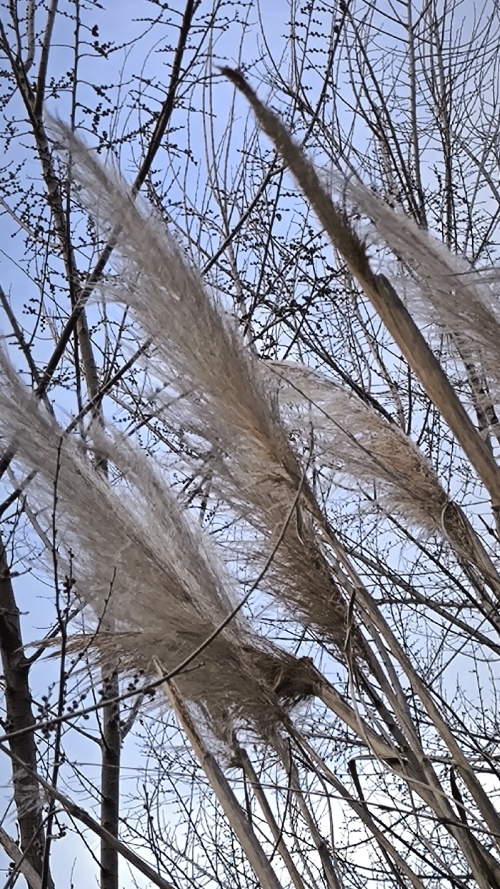 Tall pampas grass stands upright with fluffy plumes, interspersed with bare, dark tree branches against a pale blue sky
