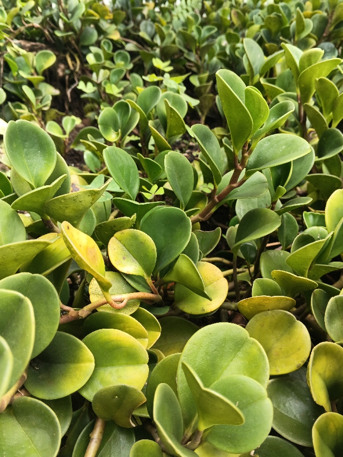 A dense cluster of oval, waxy leaves dominates the image. The leaves range in color from vibrant green to a yellow-green hue, particularly on the older leaves at the bottom. Brown stems weave through the foliage. The leaves are tightly packed and create a lush, textured appearance. The background shows more leaves, blurring further into the distance.