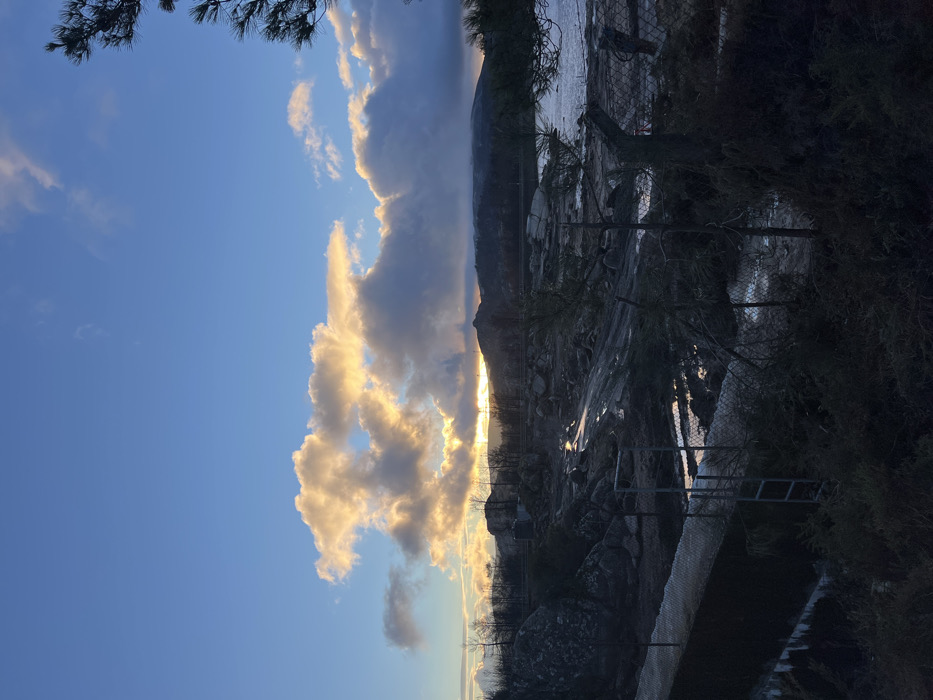 A landscape photo featuring a bright, cloud-filled sky on the left. Golden light peeks through the clouds, suggesting a sunset or sunrise. On the right, the scene transitions to darkness with silhouettes of trees and what appears to be rocky terrain. A fence is visible, and there's a hint of water reflecting the light in the distance. The image is oriented vertically.