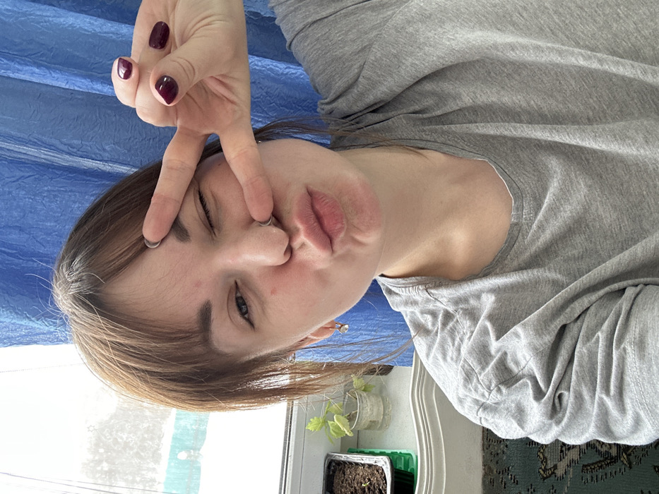 An adult female is depicted in a close-up, selfie-style indoor portrait, identified as being in the city of Фоки, Russia. She has light brown hair with bangs and is wearing a light grey t-shirt. Her right eye is winking, and her lips are puckered. Her right hand is raised, forming a V-sign with the index and middle fingers, which are adorned with dark red nail polish, partially obscuring her face. A small septum piercing is visible, along with a small hoop earring in her left ear. The background features a white windowsill on the left, holding a black planter containing soil and seedlings, and a clear glass jar with a plant cutting. A white decorative molding is present below the sill. A textured blue curtain occupies the right side of the background. Through the window, a blurred outdoor scene consistent with snow or winter conditions is visible.