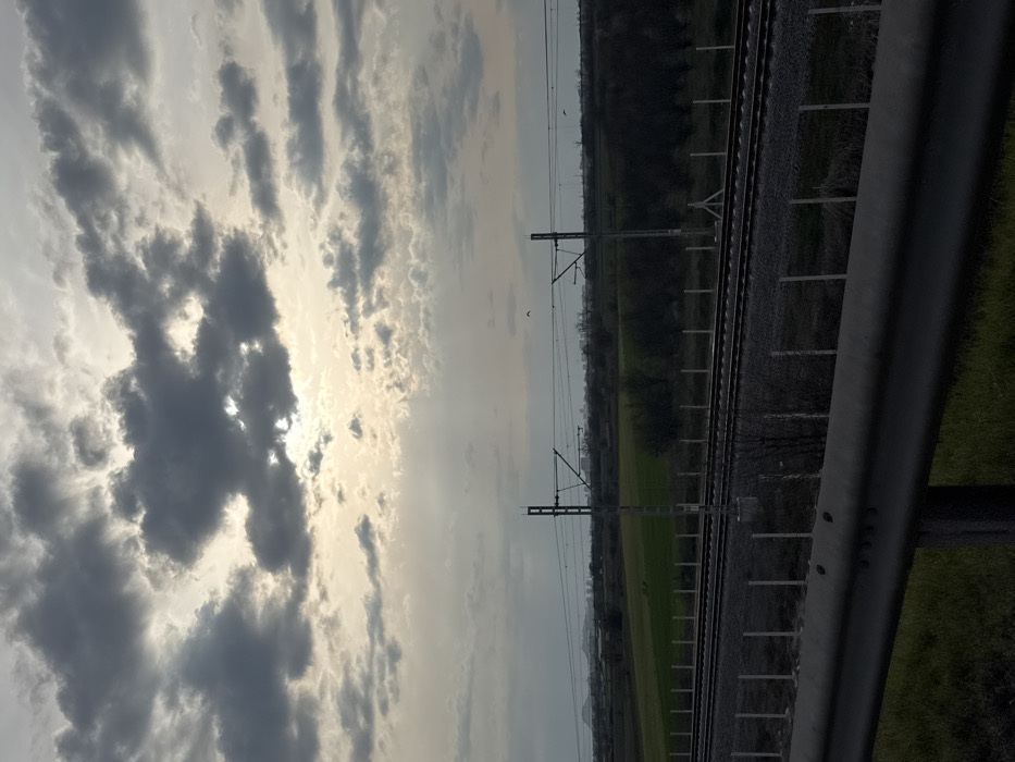 The image depicts a rural landscape within the vicinity of Skutare, Bulgaria, under an overcast sky. The upper portion of the frame is dominated by dark grey cumulus clouds, with the sun partially obscured but emitting distinct rays of light through gaps in the cloud cover, particularly towards the center-right. In the immediate foreground, a grey metal guardrail runs horizontally across the lower part of the image, partially obscuring a grassy green embankment. Above the guardrail, two parallel railway tracks are visible, laid on dark ballast. The railway line is bordered by a series of vertical grey fence posts. Overhead electrification infrastructure is present, with two prominent, tall, slender grey poles supporting a catenary system above the tracks. Beyond the railway, the midground consists of varying terrain: a stretch of dark, sparse vegetation or bare bushes to the right, transitioning into a vibrant green field to the left. Several small, dark birds are observed in flight against the sky, particularly above the overhead lines. The distant background presents a hazy panorama featuring indistinct urban structures on the horizon, with a distinct rounded hill or small mountain peak visible to the far left. No individuals or direct interactions are visible within the scene.