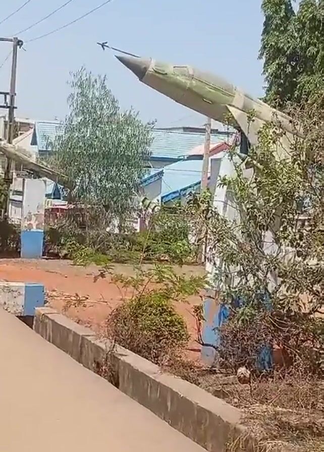 two upright missiles on display near a sidewalk. The missiles are painted in a camouflage pattern of tan and green. They are mounted on a white base with a blue trim. In the background are small buildings with blue roofs and tall trees. The sidewalk is light brown, and there is a drainage ditch running alongside it. Overhead are power lines. It is a bright, sunny day.