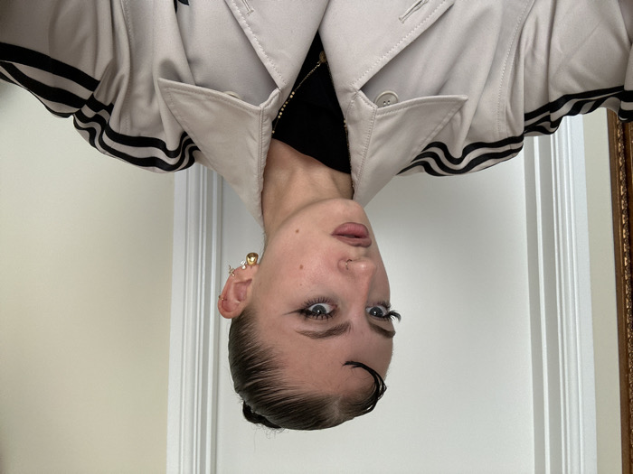 An individual, appearing to be a young adult female, is depicted in a chest-up, slightly off-center portrait shot, looking to the left of the frame. Her dark hair is styled slicked back into a bun with a prominent 's' wave curl over her left forehead. She has a full face of makeup, including defined winged eyeliner, long false eyelashes, and a light-colored matte lipstick. A silver nose ring is present in her left nostril. Her left ear (viewer's right) features multiple piercings, including a golden spherical earring, a small silver charm, and several cartilage studs/hoops. She wears a light beige or cream-colored trench coat with black triple stripes running along the shoulders/sleeves, characteristic of the Adidas brand. A black top and a delicate gold chain necklace are visible underneath. The background consists of a plain, light-colored wall with a white door frame visible on the left side of the frame, and a portion of an ornate golden mirror frame on the far left edge. The specific location within the city of North Hertfordshire, United Kingdom, is not discernible from the visual information provided in the image.