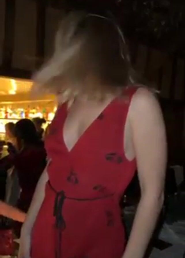 A young woman with blonde hair dances in a dimly lit, rustic-looking room. She is wearing a sleeveless red dress with a V-neck and black floral designs. A thin black cord is tied around her waist. She flicks her hair and moves her arms above her head as she dances. Behind her is a bar with illuminated bottles and other people. There's also a table with a white tablecloth and what appears to be some greenery and a candle.