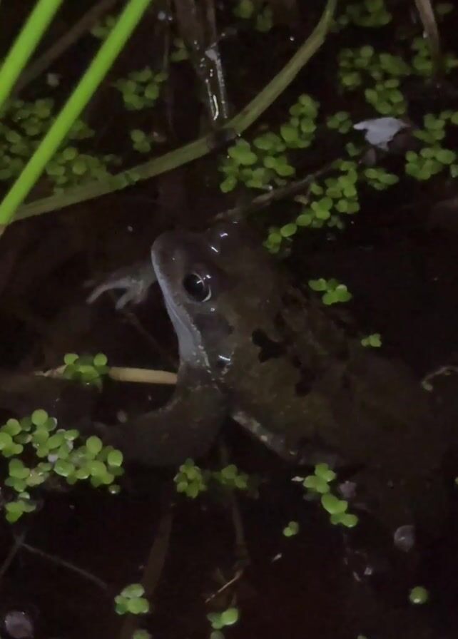 frog in a dark pond. The frog is surrounded by small, green plants and some reeds. The frog is partially submerged in the water, with its head and part of its body visible. The light in the video is dim.