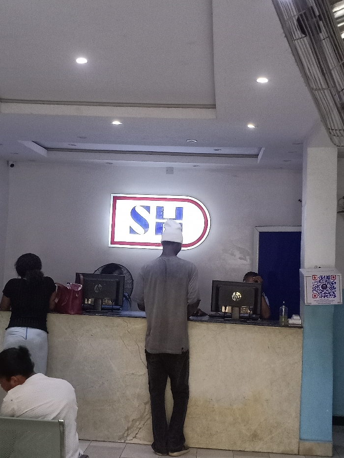 The scene depicts an indoor reception or service area in the city of Unknown, Unknown. Four individuals are present. Two individuals, an adult male in a white skullcap and grey t-shirt, and an adult female in a black top, stand at a light-colored counter, facing away from the camera. The male has his hands on the counter. The female has a red bag on the counter in front of her. Behind the counter, an individual is partially visible, obscured by an HP computer monitor. A second HP monitor and a desk fan are also on the counter. To the far left, a fourth individual is seated on a metal chair, facing away from the counter, wearing a white shirt. A prominent, illuminated sign displaying "SH" in blue letters within a white oval outlined in red is mounted on the wall behind the counter. The room features white walls, recessed ceiling lights, and a security camera in the upper left. A blue door is visible behind the counter, and a blue column with a QR code sign is on the right. A dispenser bottle is on the counter near the blue column.