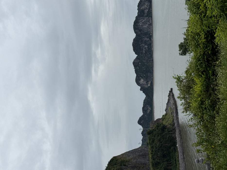The image displays an overcast coastal landscape within the Cat Ba Island area, Hải Phòng, Vietnam. In the immediate foreground, a dense array of green foliage and small white flowers is visible, with a fragment of a grey stone railing or barrier partially present on the lower left. The left midground is dominated by a steep limestone cliff, heavily vegetated, with two utility poles supporting power lines mounted on its upper section. Below this cliff, a rocky shoreline forms a small inlet, featuring a grey, rectangular concrete structure extending into the water. The central and right portions of the midground are occupied by a calm, grey body of water, indicative of a bay. The background consists of a chain of dark, rugged limestone karsts, densely covered in vegetation, rising from the water and stretching across the horizon. The sky is uniformly overcast and grey, lacking direct sunlight. No individuals, vessels, or active wildlife are present in the scene.