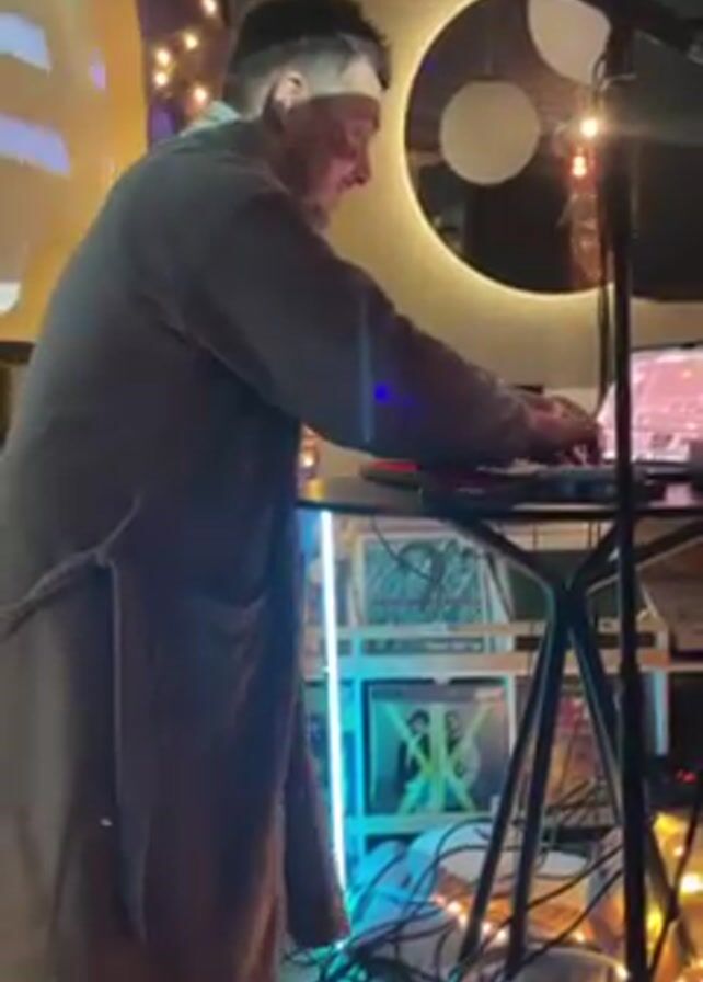 In a dimly lit space, a man in a gray bathrobe stands at a DJ setup, appearing to be performing music