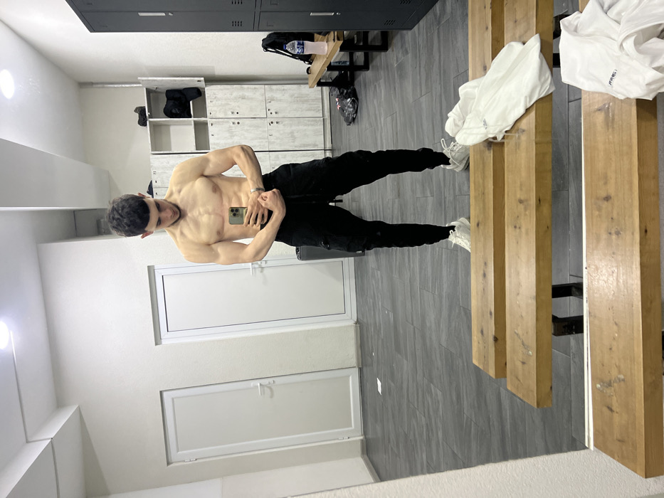 The scene depicts a male individual in an indoor facility, likely a locker room or changing area within a gym. The location is an indoor facility within the city of Unknown, Unknown. The man, appearing to be in his late teens or early twenties with short dark hair, stands shirtless, revealing a muscular physique with visible abdominal, chest, and arm definition. He is wearing black cargo-style sweatpants and white athletic sneakers, with a silver bracelet on his left wrist. He is holding a light-colored smartphone with multiple camera lenses in both hands, taking a mirror selfie. The environment includes a large reflective mirror dominating the foreground, reflecting the man and elements of the room. Behind him, on the right, are a set of dark gray metal lockers, and further left, lighter-colored wooden or laminate lockers, one with an open door revealing a black garment. A long, light-brown wooden bench extends from the right, holding a black backpack and a clear plastic water bottle with a blue label. Another similar wooden bench is present in the immediate foreground, with a white garment resting upon it. The floor is covered with dark gray rectangular tiles. In the background on the left, two closed white doors with silver handles are visible. The walls are light-colored and textured, and the area is illuminated by overhead recessed lighting. The individual is posing, subtly flexing his muscles and looking towards his phone/reflection.