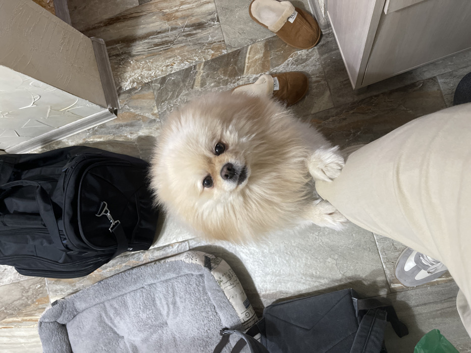 - "An indoor photograph taken in Omurtag, Bulgaria, depicts a light cream-colored Pomeranian dog with its front paws resting on a human leg" by FM-fEXjF2, licensed under CC BY 4.0