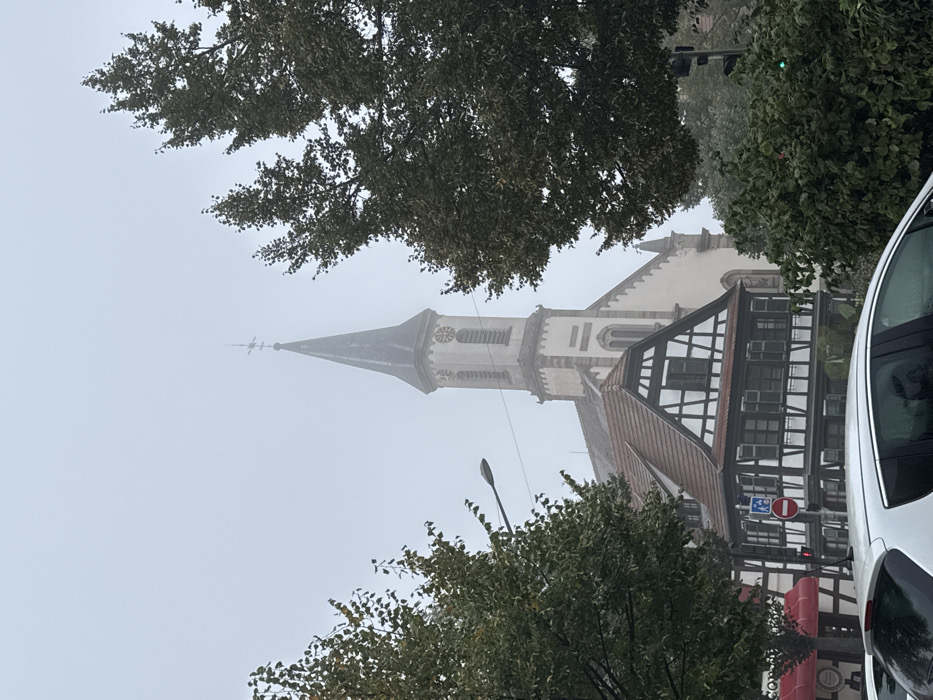 The image captures a street scene in Hoenheim, France, under a hazy or foggy sky. The prominent subject is a light-colored stone church featuring a tall, pointed steeple topped with a cross and a finial. A clock face is visible on the steeple's upper section. Directly in front of the church, to the lower left, stands a traditional half-timbered house with a brown tiled roof, white walls, dark wooden beams, and dark window shutters. To the far left, a building with a red awning is partially visible. The immediate foreground shows the right side of a white passenger vehicle, with reflections suggesting moisture on its surface. The scene is partially framed by trees with green foliage on both the left and right sides. A street light fixture is visible above the left-side trees. Traffic signs, including a blue circular sign with a white bicycle symbol and a red circular 'no entry' sign, are positioned near the half-timbered house. A green traffic light is partially visible behind the right-side trees. No individuals are depicted.