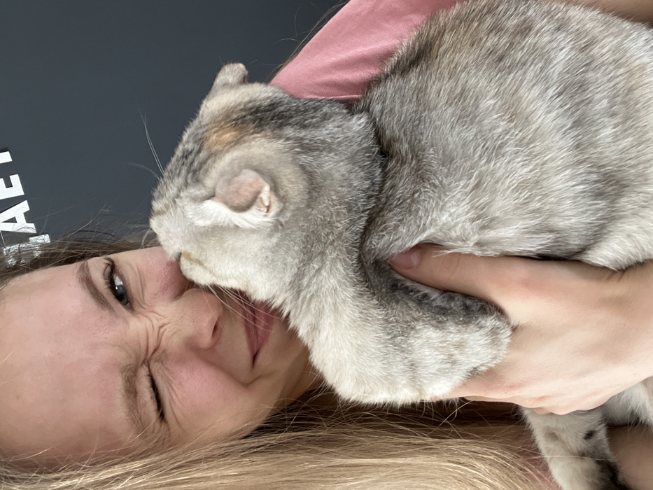 The image displays a close-up indoor scene, purportedly in Ludorvay, Russia, featuring a woman and a domestic cat. The female individual, with blonde hair and a light complexion, occupies the left side of the frame, winking with her left eye and scrunching her nose, indicating a playful or affectionate expression. She is wearing a light pink top. Her right hand is visible, holding a small, grey and white tabby cat against her face. The cat exhibits folded ears and is pressing its head into the woman's nose and left cheek area, appearing to nuzzle her. The background consists of a dark grey wall with partially visible white uppercase letters, resembling "TAE" or "LAE," near the top edge. The lighting is soft and ambient.