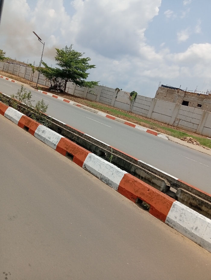 The image displays an urban roadside scene in Uyo, Nigeria, under daylight conditions. In the immediate foreground, a paved road surface is visible, bordered by a concrete curb painted in alternating white and rust-orange segments. Immediately beyond this curb is an open concrete drainage gutter, partially filled with sediment and minor vegetation. A two-lane paved road, devoid of visible traffic, extends diagonally across the mid-ground. A narrow dirt median strip with sparse green growth separates the road from a taller concrete perimeter wall. In the background, a tall, grey metal streetlight pole equipped with a solar panel is positioned to the left. Adjacent to it stands a mature green tree. The light-grey concrete perimeter wall, constructed from rectangular panels, spans the width of the background. Behind the wall on the left, a plume of light grey smoke rises into the sky. To the right, a multi-story building under construction, primarily composed of exposed concrete blocks and rebar, is visible above the wall. The sky above features a mix of blue and scattered white cumulus clouds. No people or vehicles are present within the frame.