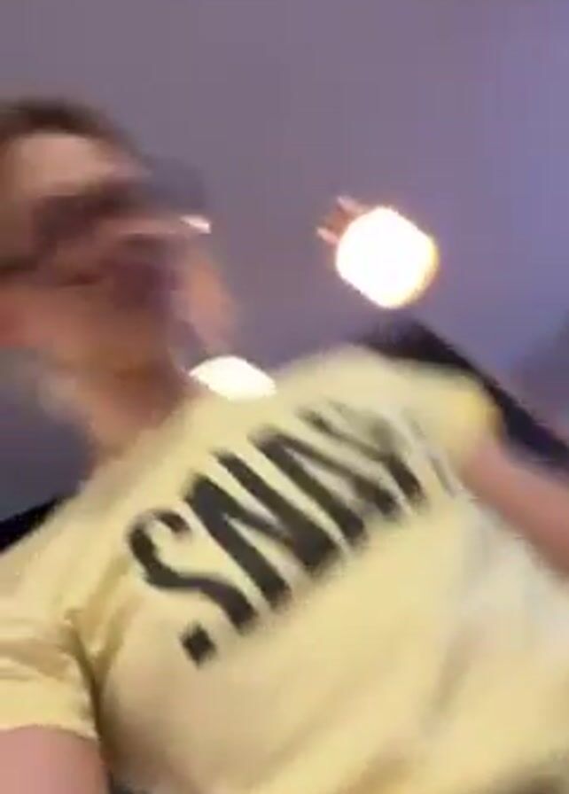 A woman wearing glasses and a yellow t-shirt with the word "SNAP" written on it is standing in what appears to be an indoor space, possibly a shop or waiting area. She's attaching a black harness or strap, possibly for a bag or carrier, around her waist. The camera angle is mostly from below, looking up at her. The lighting is bright, and there are ceiling lights visible in the background.