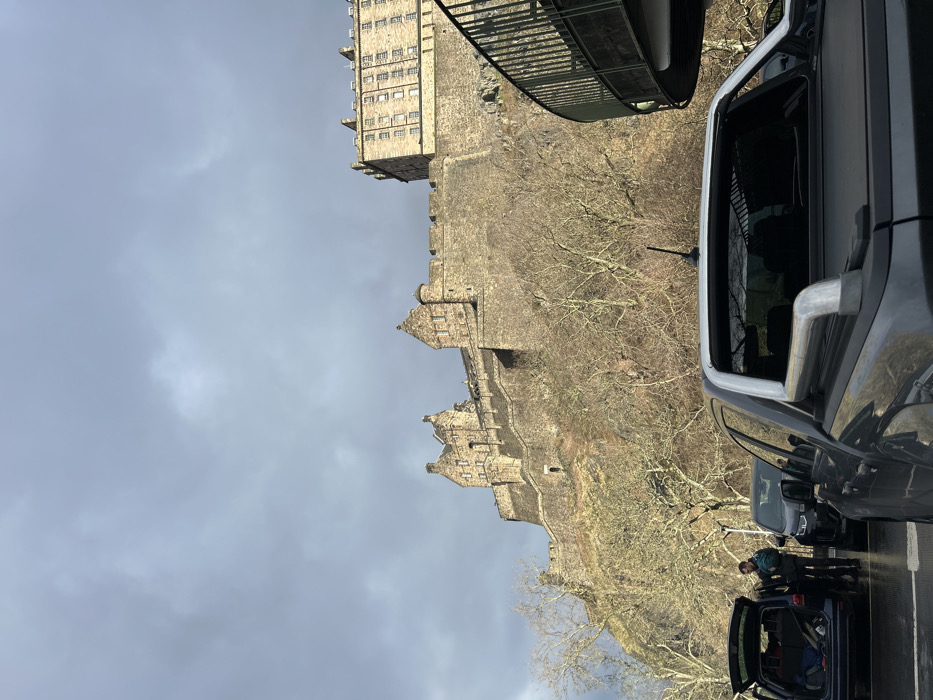 The scene is set in the City of Edinburgh, United Kingdom, featuring Edinburgh Castle under an overcast sky with intermittent bright light. In the immediate foreground, a dark grey pickup truck is parked, showing its rear bed cover and a silver roll bar. To its left, a dark blue estate car or SUV is parked with its tailgate open. Two individuals are standing near the open tailgate; one person wears a dark jacket over a green top and appears to be engaging with items in the vehicle. Behind the vehicles, the steep, rocky slope of Castle Rock ascends, populated by numerous bare deciduous trees and dry brush. Edinburgh Castle, a formidable stone fortification, dominates the upper background, built directly onto the rock face. Its extensive stone walls, multiple turrets, and various buildings are visible, including a prominent multi-story structure with numerous windows, consistent with the National War Museum of Scotland, positioned to the right of the main castle complex. A segment of a green metal railing and a circular architectural feature are partially visible on the far right midground.