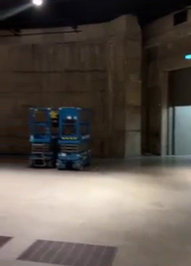 large, empty, concrete room with an industrial feel. The walls are made of concrete blocks. Two blue scissor lifts are parked near the wall. The ceiling is dark with visible pipes and electrical fixtures. Light fixtures are scattered on the ceiling, casting light onto the floor. There's a large metal door slightly ajar in the distance. The floor appears to be concrete with some metal grates. The camera moves around the room, showing its dimensions and layout.