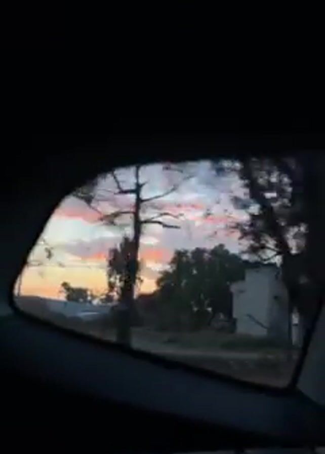The video is taken from inside a moving car, looking out the rear window. The main focus of the shot is the scenery visible through the car window, which includes trees, buildings, and a vibrant sunset sky. The sky is a mix of pink, orange, and purple hues, suggesting either dawn or dusk. The trees and buildings appear dark against the bright sky, creating a silhouette effect. The car is moving, as evidenced by the changing scenery. The interior of the car is dark, with only a glimpse of the seat visible.