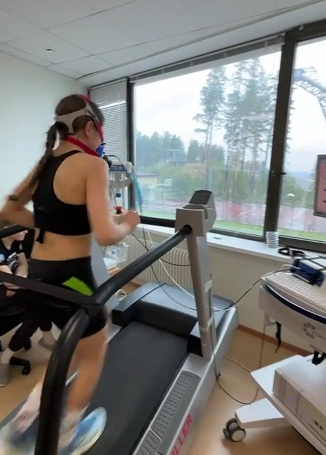 A woman is running on a treadmill in a bright room. She is wearing a black sports bra and black shorts with a green stripe. She has a mask covering her nose and mouth, and a sensor strapped to her head. Her hair is in a braid. The treadmill is a SCHILLER brand, and there is a computer monitor showing numbers next to it. Behind the treadmill is a large window looking out at a rainy landscape, including a ski jump tower. There is another person sitting to the left, presumably monitoring the treadmill.