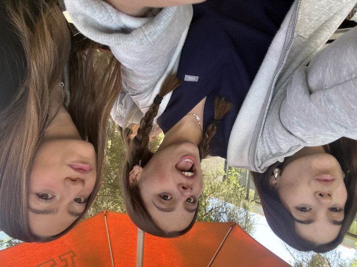 The image displays three young adult females posing for a photograph outdoors in the city of Unknown, Unknown. The scene is illuminated by natural daylight and features a large orange umbrella overhead, partially obscuring green foliage and a building in the background. The female on the left has long dark hair, wears a light grey zippered hoodie over a dark top, and silver hoop earrings. Her lips are pursed, and she looks directly at the camera. The central female has long brown hair styled in two pigtail braids. She wears a navy blue "FIGS" brand scrub top, small silver earrings, and a necklace with small white charms. Her mouth is open wide in an exaggerated expression, revealing her tongue. The female on the right has long light brown hair, wears a dark top, and a silver necklace with a circular pendant. Her lips are also pursed, and she looks towards the camera. A fourth individual is partially visible behind the central female, wearing a light grey shirt with a dark "NM" or "MV" logo.