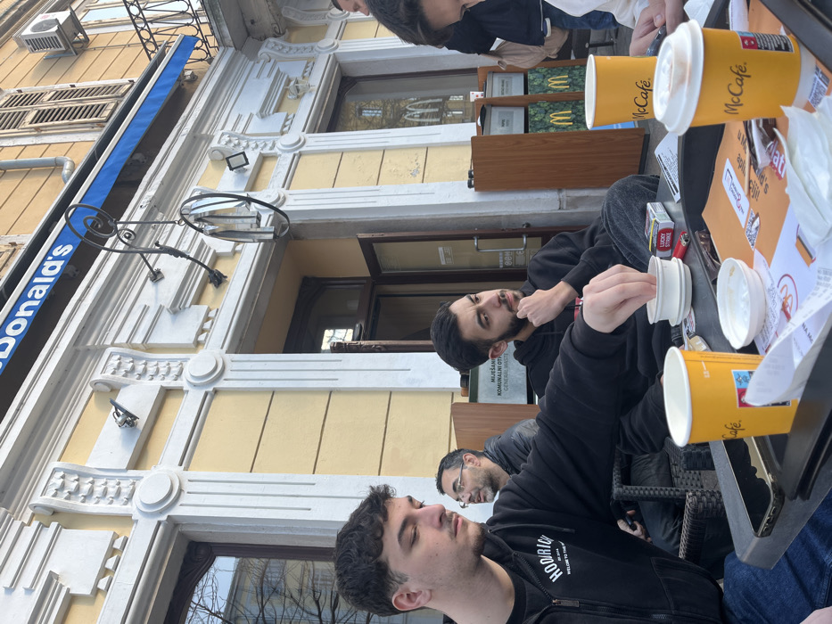 The image depicts an outdoor seating area of a McDonald's McCafe located at a historic building in Grad Rijeka, Croatia. The specific location is identifiable by the building's ornate yellow facade with white decorative architectural elements, the prominent blue "McDonald's" sign, a wrought-iron 'M' logo, and a green waste bin labeled "MIJEŠANI KOMUNALNI OTPAD GENERAL WASTE." In the foreground, a young adult male with dark, curly hair and a mustache, wearing a black "HOODRICH" hoodie, is seated at a dark wicker-style table, his right hand reaching into a small white bowl. On the table, resting on a black tray, are multiple yellow McCafe paper cups (some with lids, some empty), a pack of Lucky Strike cigarettes, a red lighter, and scattered papers. To the right of the foreground male, another young adult male with a beard and dark hair, wearing a black hoodie, is seated, looking contemplatively to his left with his right hand under his chin. In the mid-ground, a third male with glasses is partially visible, seated and looking to his right. A fourth person is partially visible on the far right, looking down at a smartphone. The background features the yellow building facade with large windows reflecting the surroundings, an open glass door leading into the establishment, and a blue awning above. Above the awning, brown window shutters and an air conditioning unit are visible, along with part of a metal balcony railing on the upper floor. The scene is illuminated by natural daylight, suggesting daytime.