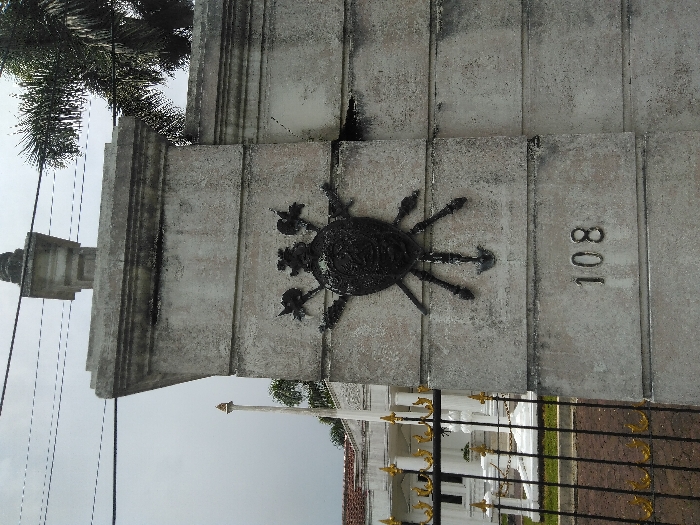 A partial view of a weathered, light-grey concrete gate pillar stands at the forefront, located at Eiksveien 108, Oslo, Norway. Centrally affixed to the pillar is a dark, metallic, ornate emblem, identified as the Garuda Pancasila, the national emblem of Indonesia, featuring a shield-like body and radiating stylized elements. Below this emblem, the house number "108" is displayed in dark, raised metallic numerals. To the left of the pillar, a black metal gate with gold-colored scrollwork decoration is visible, partially open. Beyond the gate, a manicured green lawn leads to a white building with a red-tiled roof and prominent white classical columns, characteristic of the Indonesian Ambassador's Residence. A tall, white flagpole is discernible behind the gate. The sky is overcast and light grey, and several black utility wires are stretched across the upper portion of the frame. On the far right, the fronds of a large palm tree are visible against the sky. The pillar itself exhibits signs of weathering and discoloration.