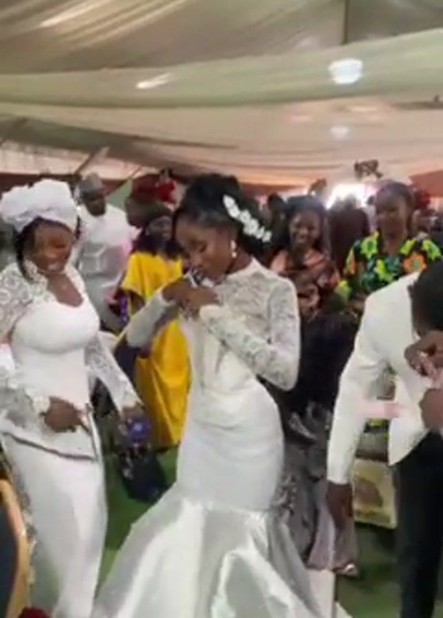 wedding reception. A bride in a white mermaid-style wedding dress with lace sleeves and a fitted bodice is dancing with two other people. A woman in a white pantsuit and head covering dances to her left. To the bride’s right, a man in a white tuxedo with a black bow tie moves her dress train so that she can move freely. The reception venue is decorated with white fabric draping from the ceiling. Several guests are visible, wearing various formal attire. The bride appears to be of African descent.