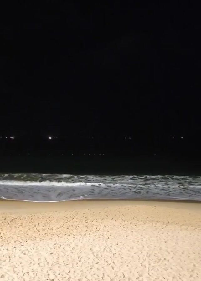beach at night. The sand is light in color, and the ocean waves are visible, illuminated by ambient light. In the distance, along the horizon, there are some city lights, suggesting a distant urban area. The sky is dark, and the overall scene has a calm and serene feel. There are no people visible.