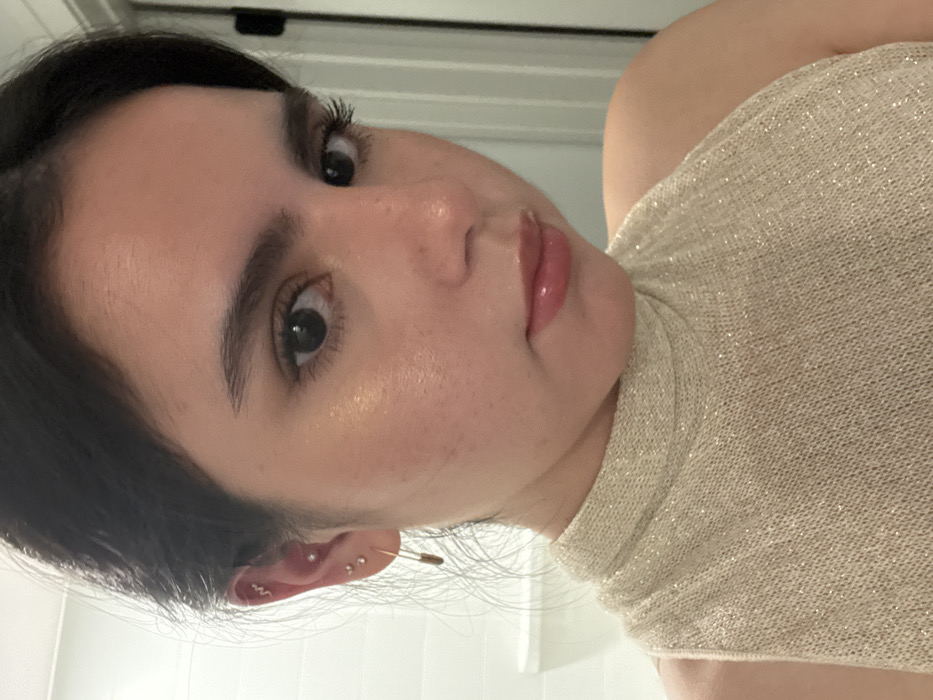 A close-up, chest-up indoor portrait captures a female subject looking directly at the camera. The subject has dark hair, dark eyes, and a light-to-medium skin tone, with defined eyebrows and a glossy finish on her lips. She is wearing a light gold or champagne-colored sleeveless top with a high, possibly turtleneck-style collar, featuring a shimmery fabric weave. Her visible right ear (viewer's left) displays multiple piercings: a wavy, silver-toned stud in the helix, a small, silver-toned ball stud in the tragus, a small clear stud in the upper lobe, and a gold-toned small safety pin earring dangling from the lower lobe. The background is indistinct and light-colored, suggesting an interior space like a bathroom, with a white horizontal fixture visible on the left and a dark vertical element, possibly a door frame or mirror edge, on the right. The lighting appears artificial, creating highlights on the subject's skin. The specific location within Austin, United States of America, cannot be determined from the image.