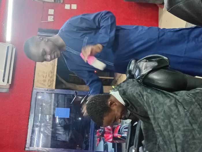 This image depicts a barbershop interior in the city of Dorayi, Nigeria